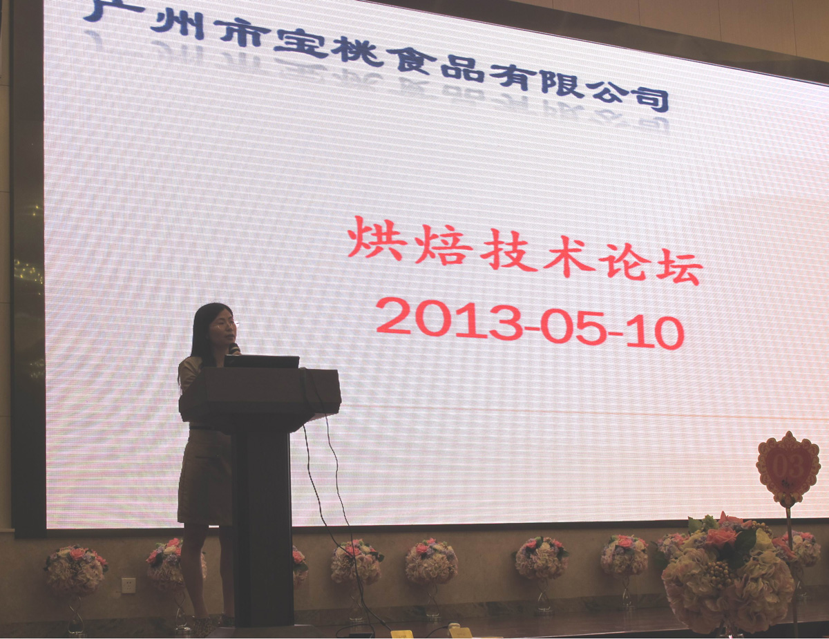 下午5:05,宝桃公司烘焙技术论坛在稻香酒家(番禺奥园广场店)宴会厅准时开始,宝桃公司总经理谢琼瑶担任论坛的主持人,论坛上,谢总代表宝桃公司全体同仁们对各位嘉宾的支持和光临,表达最热烈的欢迎和由衷的感谢,并对烘焙业的兴起与发展以及目前行业现状做了全面而又详细的解说与分析,为后面的嘉宾演讲主题抛砖引玉。接着,宝桃公司技术顾问宋秀光先生以宝桃优面膏为例,为大家详细讲解了乳化剂在烘焙产品中的应用;南京师范大学金陵女子学院食品科学与工程系讲师——刘琛女士与大家一起分享了她的课题:宝桃优面膏对面团粉质特性及面包品质的作用研究。通过两位老师的讲解,大家更加清楚地了解宝桃优面膏增加面团乳化效果、整体保气性和弹性,使面包的组织结构更细腻柔软、改善面包的质构特性, 并在贮藏过程中能有效延缓面包老化等作用,并且都通过科学的验证和精确的实验数据来真实地体现宝桃优面膏对于面团、面包、蛋糕等成品的实际效果,从而大大增强了大家对优面膏的了解和功能的认可。